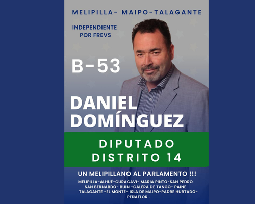 ¡VECINOS Y VECINAS! SOY DANIEL ANTONIO DOMÍNGUEZ GONZÁLEZ, TÉCNICO EN CONSTRUCCIÓN, CORREDOR DE PROPIEDADES Y ESCULTOR EN MADERA. HIJO ÚNICO DE MARTA GONZÁLEZ (PELUQUERA), QUIEN HA SIDO MADRE Y PADRE, NACIDO Y CRIADO EN MELIPILLA, TIERRA DE HOMBRES Y MUJERES DE ESFUERZO, DE ELLOS APRENDÍ EL VALOR DE LA AMISTAD, LA HONESTIDAD, EL TRABAJO Y LA SOLIDARIDAD. SIEMPRE HE DEFENDIDO MI COMUNA QUE ES ESENCIALMENTE RURAL Y HOY QUIERO DEFENDER DE IGUAL MANERA LAS PROVINCIAS DEL MAIPO, TALAGANTE Y MELIPILLA.